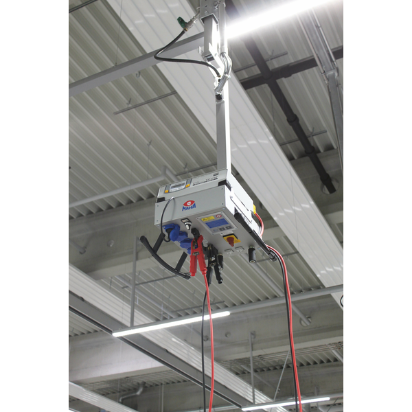 Para un uso óptimo, la nueva E-BOX cuelga del techo y ofrece, además del suministro de electricidad y aire a presión, un mando integrado para el elevador y una conexión de cable LAN, también un estante para cargadores de baterías – una combinación práctica que por fin soluciona todos los problemas de suministro de energía en el puesto de trabajo en el taller.