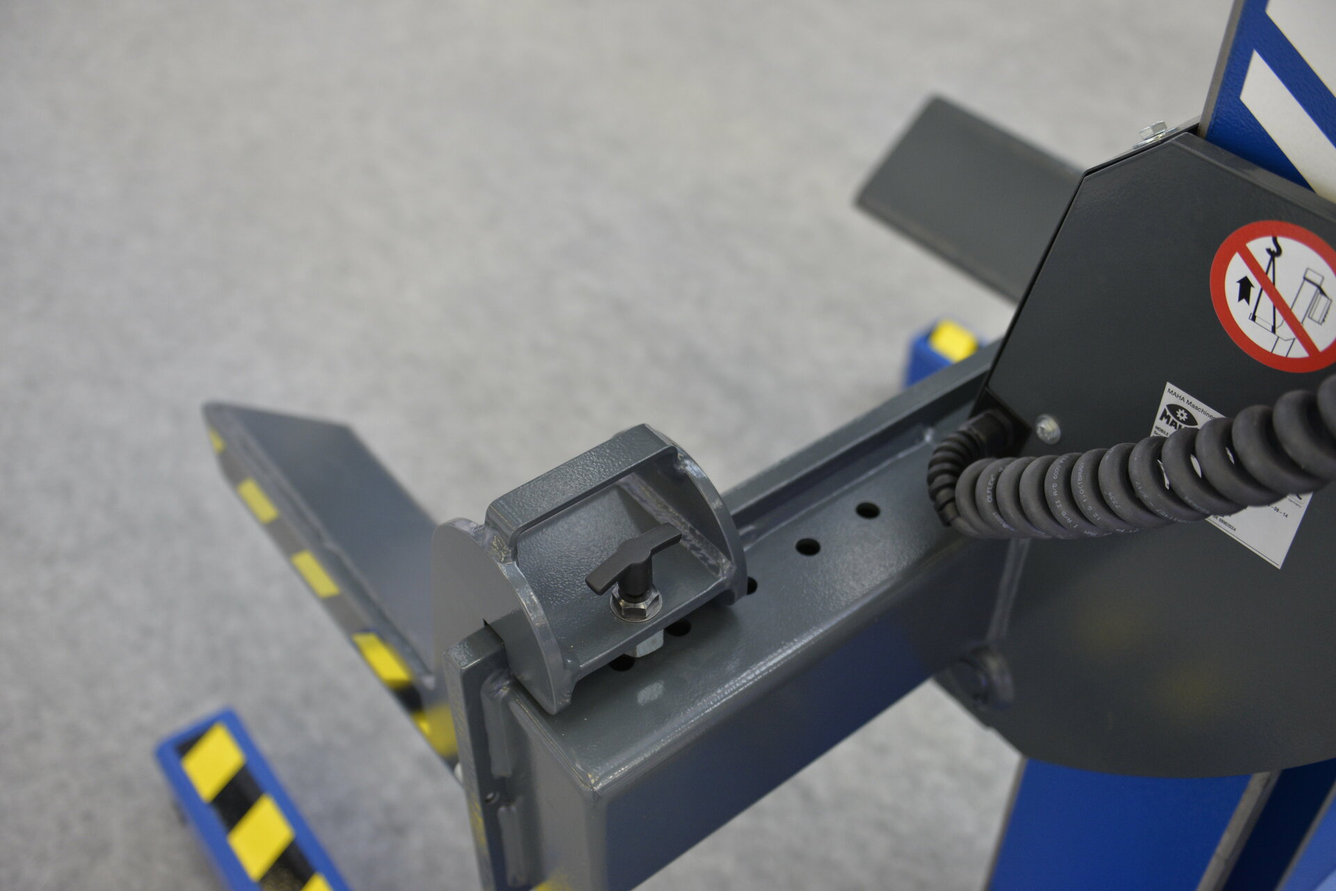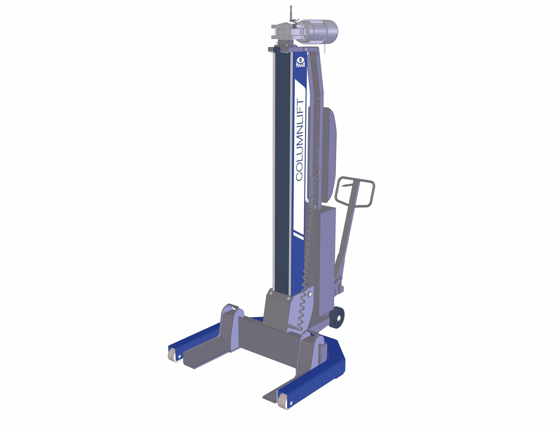 Gracias al accionamiento electromecánico empleado por MAHA, en comparación con los derivados electrohidráulicos tampoco existen pistones y/o cilindros saliendo hacia arriba de la columna que puedan ocasionar daños en el vehículo. Este hecho afecta especialmente a la posibilidad de aplicación universal de elevadores móviles de columnas tanto para turismos como incluso para vehículos pesados de formas constructivas muy distintas, y apoya el uso no estacionario del producto y los áreas de aplicación flexibles de nuestros productos. El diseño de columna estilizado permite una maniobra muy despejada y/o un posicionamiento también en espacios reducidos, mientras que la unidad de accionamiento superior ofrece aún más espacio en el área de trabajo. El motor con engranaje helicoidal del accionamiento por husillo funciona sin arrastre.