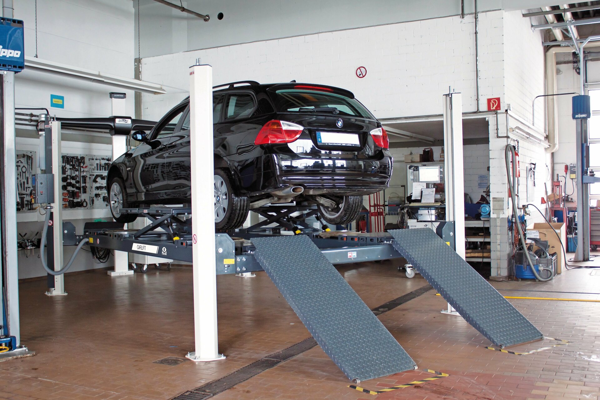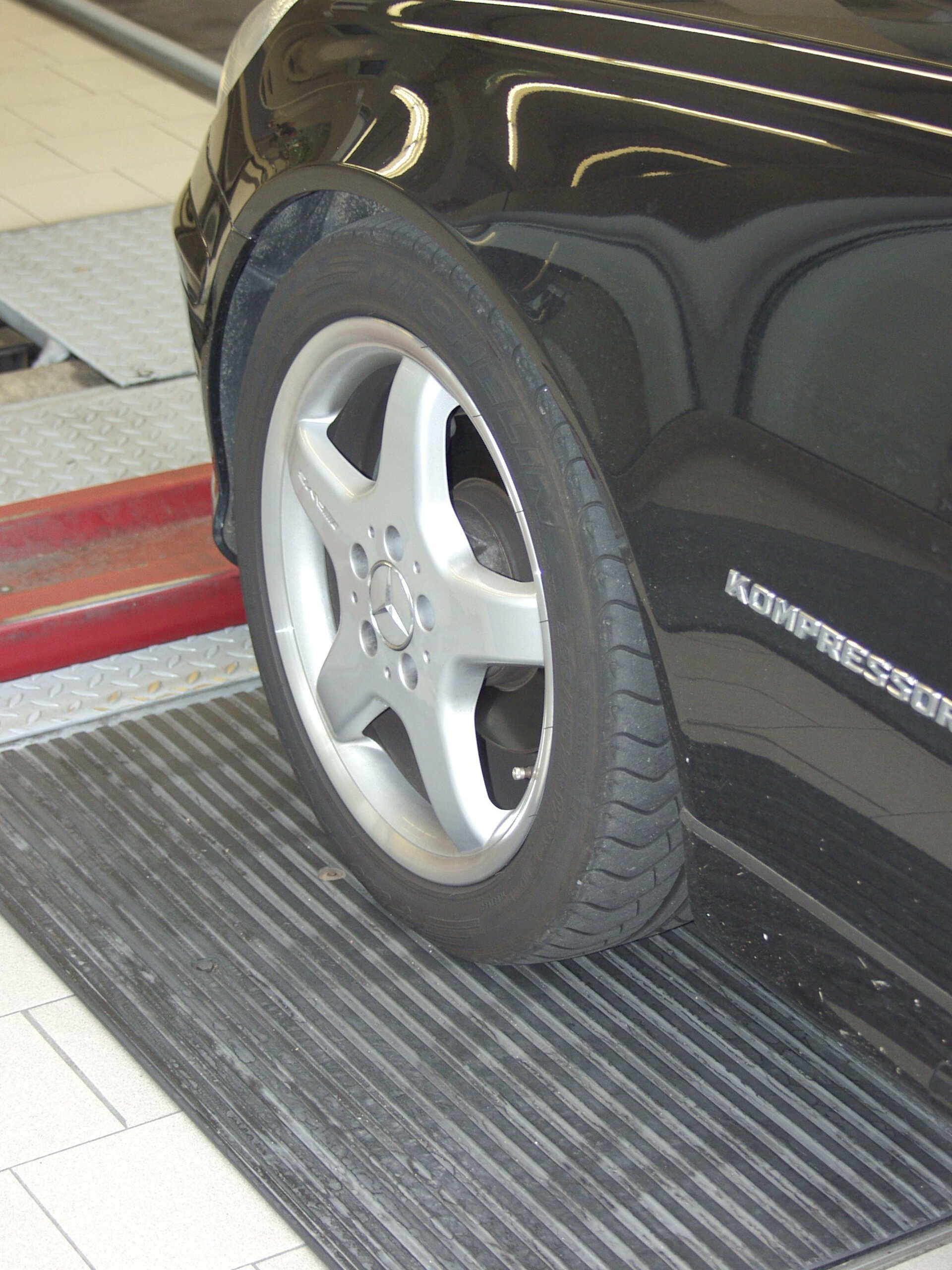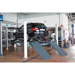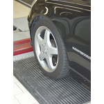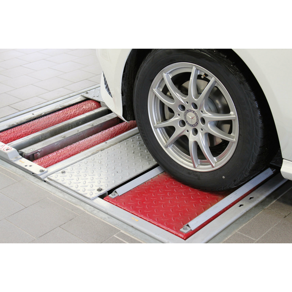 Otro motivo para un desgaste unilateral en el neumático también puede darse por valores inadecuados del ángulo de caída, lo que se manifiesta mediante un desgaste aumentado en el hombro exterior o interior. Mediante una medición exacta del chasis sobre una plataforma especialmente diseñada en el taller especializado, se puede identificar claramente y corregir esta posición errónea. MAHA ofrece distintos modelos para este cometido, que se caracterizan por su alta precisión: el elevador de cuatro pistones VS SQUARE II es idóneo gracias a sus plataformas exactamente alineadas y las placas deslizantes para un apoyo de la rueda sin tensión así como la compensación de niveles de las plataformas y el dispositivo de posicionamiento con raíl de trinquete. Lo mismo vale para el elevador de cuatro columnas CARLIFT II.
