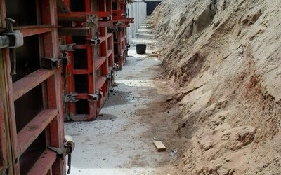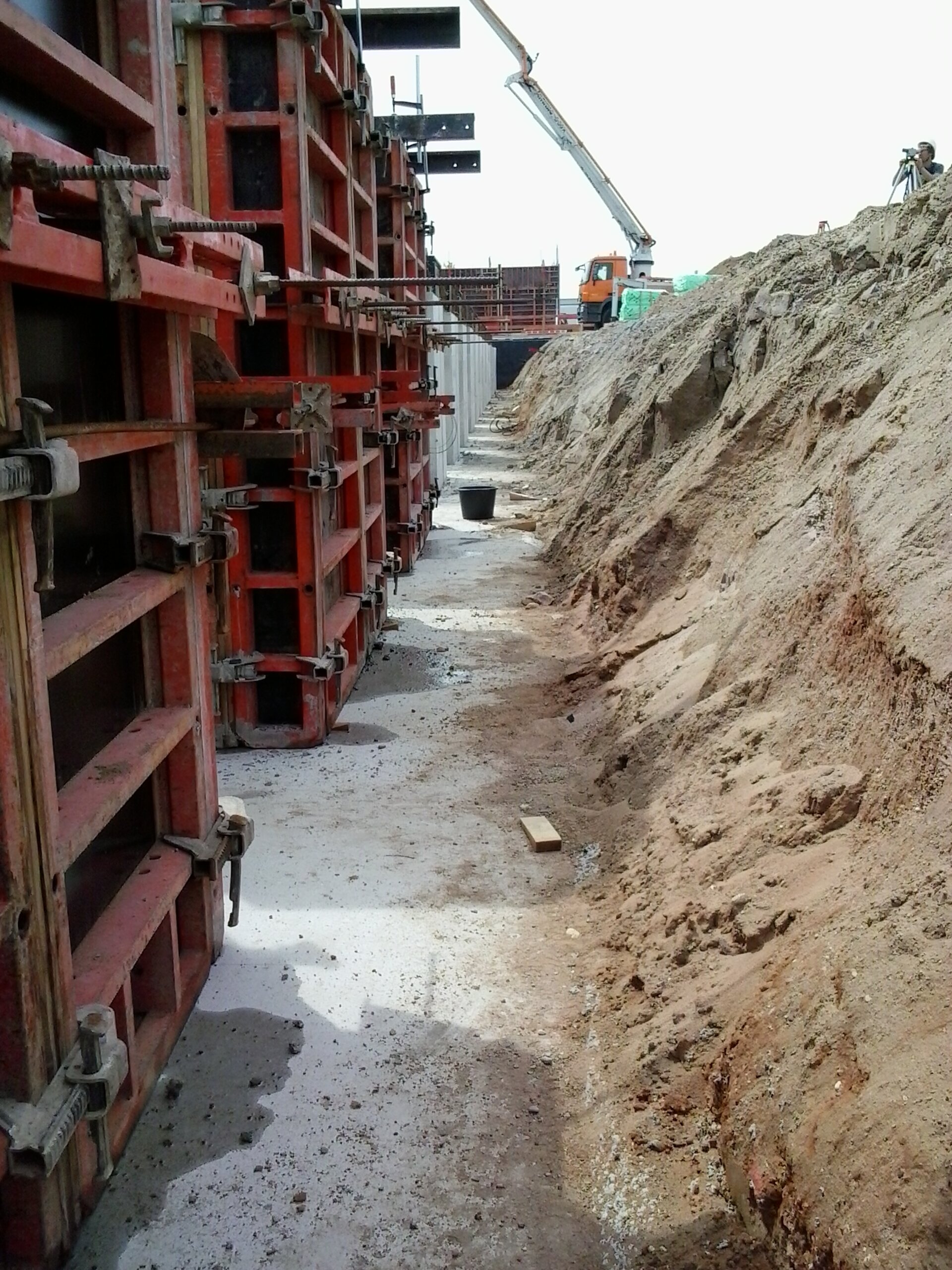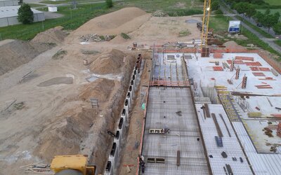 A continuación, se alinearon de forma milimétrica con ayuda de un geómetro y las aljabas se hormigonaron paso a paso. De esta forma, fueron posicionados 26 casetes y colocados a la altura correcta. Después de trazar las aljabas, los fundamentos pudieron rellenarse con arena y se pudo construir el área de talleres alrededor de los casetes.