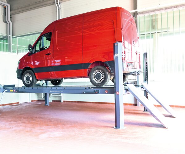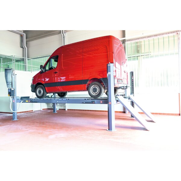 - Elevador de cuatro columnas con accionamiento electrohidráulico para montaje sobre suelo