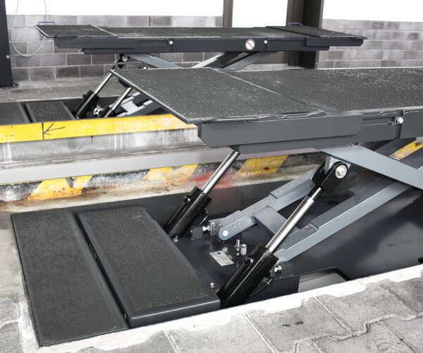 - Instalación a ras de suelo sobre el foso, sin conexión mecánica entre ambas tijeras