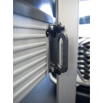 - Equipado de serie con ruedas de plástico con rodamientos de agujas rodillos semicirculares de plástico para su uso en nuestras guías semicirculares de acero inoxidable